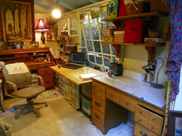 Tomorrow I'm leaving on another mini self directed art retreat. Then school begins a week from today!! Taking a mixed media class, so I really needed to spiff up my studio. Took out the tall and big easel, since I like to work off a desk. Also, took back the fab art table since my honey wasn't using it.