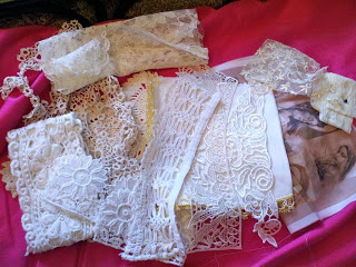 Oh yes.... it was one of those days. I had three sales on my list, all scattered around San Jose. But it was the middle sale that rang my chimes! Doncha love, leaving the crowds milling through the kitchen gadgets, the dining room tables filled with delicate china... to wander out to the almost empty garage, and to behold, there, in a dusty corner a BOX OF VINTAGE TRIMS!!!! Yep. Score! I also picked up an armload of pretty doilies and a few bits of this and that.....