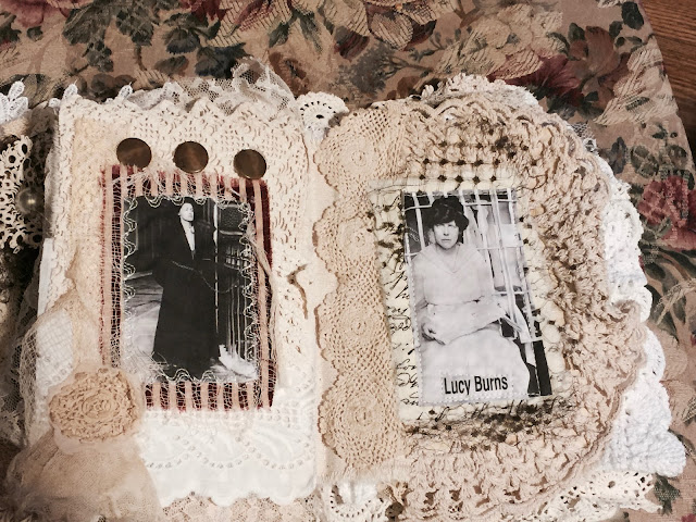 Since my first 'Book of Spells' sold already, I thought I'd do another one.... Same images, with more 'Fortune Cards' (with journaling tag on backs), and lots and lots of spooky laces and fabrics! Included are two mini journaling books, and twelve Fortune tags with journal spots on back. Several pages flip out to reveal...well, you'll see. ON SALE IN MY ETSY SHOP.
